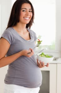 Pretty pregnant woman holding a bowl of salad while standing in the kitchen